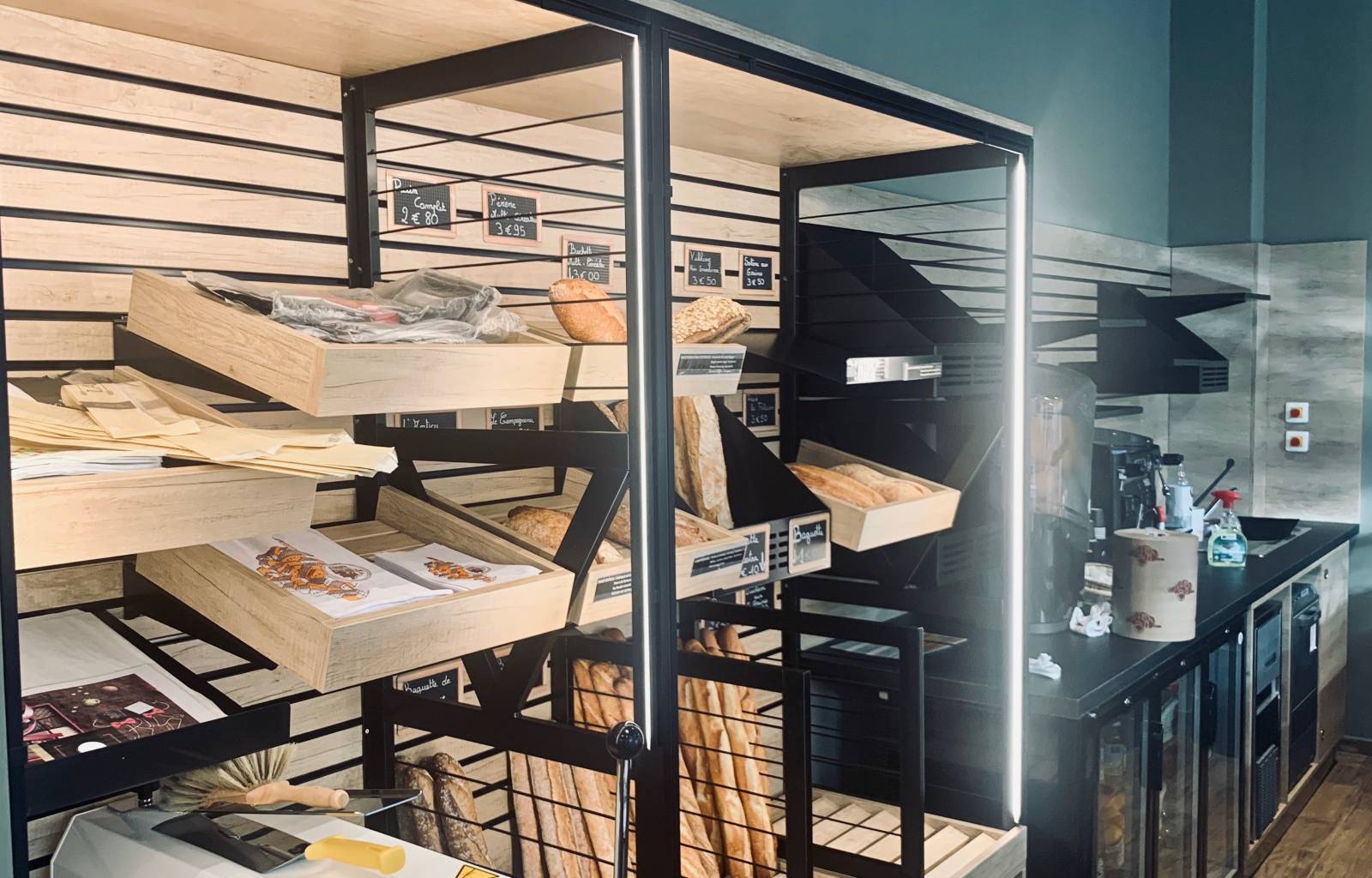 Habillage de l'ESPACE CAFE & JUS DE FRUIT, avec un Stockage positif de boisson en partie basse (arrière bar) et CRÉDENCES MODULABLES avec Etagères Bois & Métal.