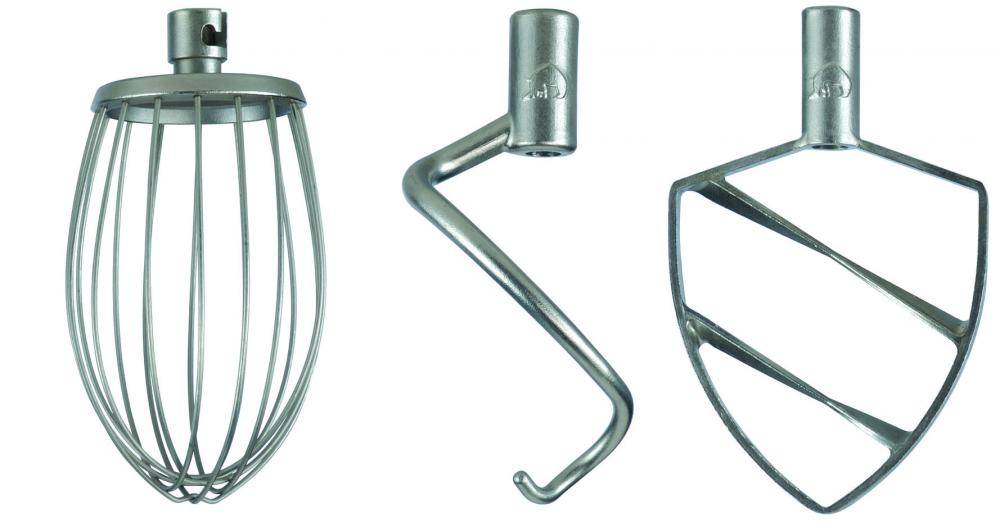 Le batteur est fourni avec un bol, un couvercle, des protections anti-éclaboussures, un plateau de remplissage, un fouet, un crochet et une palette.