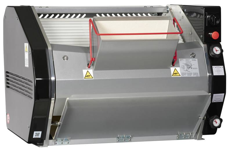 Đu point de vue Sécurité, la goulotte haute et évasée permet de conserver les mains à bonne distance des rouleaux pour éviter tout accident. La barre rouge, si elle est actionnée, arrête automatiquement la façonneuse.