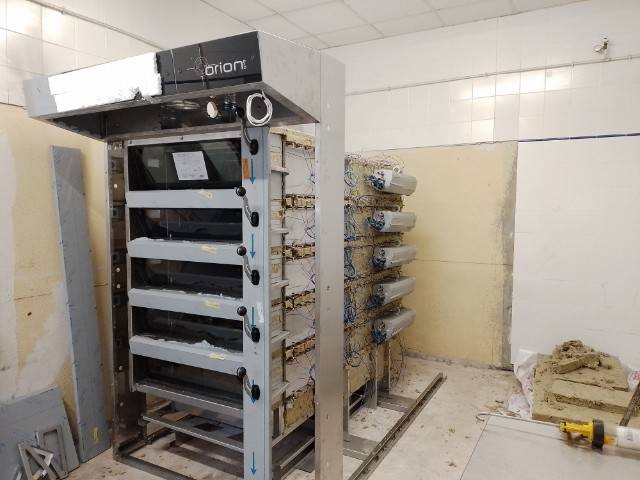 Démontage et remplacement du Four de boulangerie en une voie de 800 sur 5 Etages permettant la diversification des cuissons et d'adapter les cuissons en fonction des utilisateurs.
